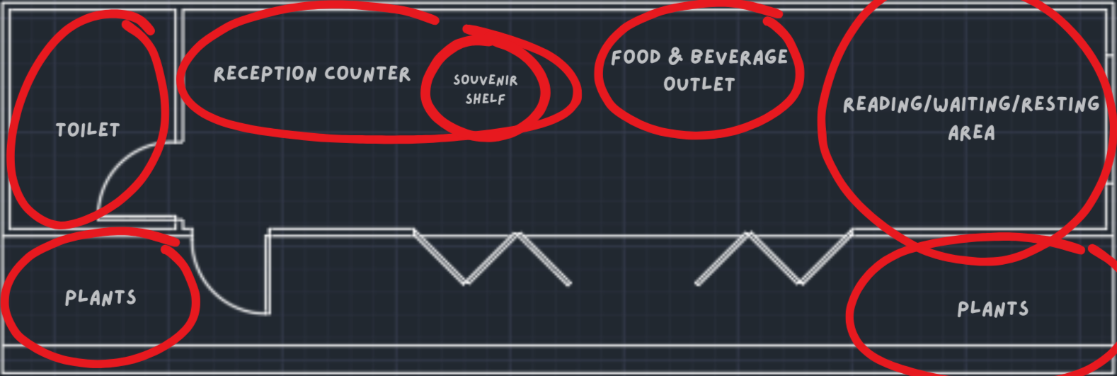 - Reception counter is the first channel of communication between patrons and staff. It is strategically placed in front of the entrance to encourage the first interaction.